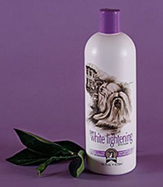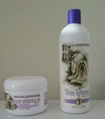 ALL SYSTEMS WHITE LIGHTENING SHAMPOO & SUPER RICH CONDITIONER, PLUS THE SHAZAM STAIN REMOVER GEL, AIDED IN PRODUCING THE SNOW WHITE COAT.